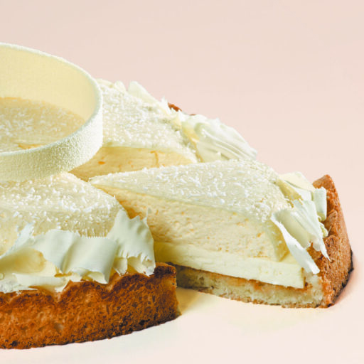 Placer les mousses légères noix de coco sur grille puis les glacer avec le glaçage miroir à 30°C. Immédiatement après le glaçage, placer la grille quelques minutes au surgélateur afin de bien fixer le glaçage. Parsemer de coco râpée. Déposer les mousses glacées sur les fonds de dacquoise noix de coco recouverts de crémeux noix de coco et vanille de Madagascar puis masquer les bords de copeaux de chocolat blanc. Décorer le dessus avec des décors en chocolat blanc.