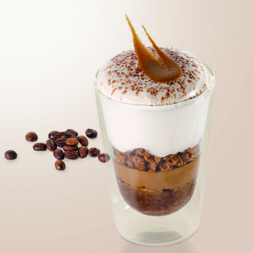 Détailler des disques de biscuit cuiller du même diamètre que le fond des verres, les imbiber de sirop saveur café puis les déposer délicatement dans les verres. Placer les verres au réfrigérateur. Sitôt le crémeux saveur café réalisé, le répartir dans les verres puis réfrigérer. Au moment du service, déposer du crumble saveur café sur le crémeux puis, au siphon, garnir les verres de crème au mascarpone saveur vanille. Saupoudrer légèrement de cacao et décorer d’une tuile au café avant de servir.