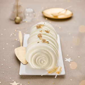 Sous son élégant décor en velours blanc en spirale, la Bûche Façon Piña Colada est une invitation au voyage sublimant l’alliance parfaite de l’ananas et de la noix de coco. Elle se compose d’un crumble croustillant à la noix de coco, d’un insert d’ananas rôtis, et d’une mousse bavaroise à la noix de coco, offrant une touche de fraîcheur idéale pour conclure un bon repas.