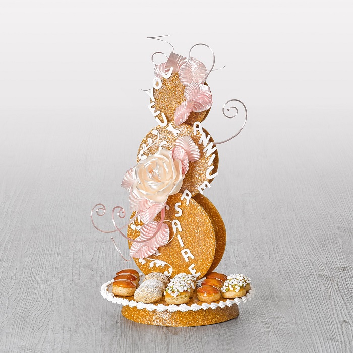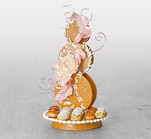 Une pièce montée à base de nougatine et choux au crumble craquants garnis de crème pâtissière nature, de crème pâtissière à la noisette et de crème pâtissière à la vanille et à la pistache.