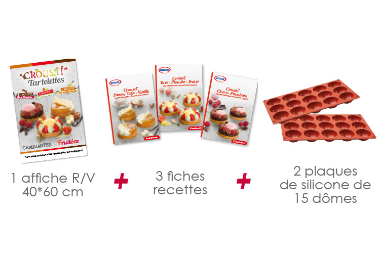 Pour l’achat de 8 produits ancel, Sébalcé et cresco dont au moins 10 kg de Crème Pâtissière ancel, chaque artisan se verra remettre un kit de communication comprenant : 1 affiche R/V pour communiquer sur l’opération en boutique, ainsi que 3 fiches recette et 2 plaques de 15 mini-dômes pour réussir parfaitement ces tartelettes.