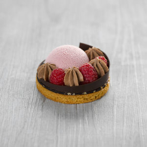 • Crousti’ Framboise-Choco : un croquant à la saveur intense de chocolat avec des amandes caramélisées, une mousse framboise et une crème diplomate au chocolat accompagnée de framboises.