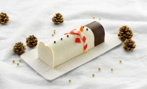 Sous son décor velours blanc, la Bûche Bonhomme de Neige associe une dacquoise croustillante à la Noisette du Piémont, surplombée d’une délicate mousse à la Vanille Tahitensis, d’une bavaroise à la Noisette du Piémont et d’un crémeux chocolat à l'orange.