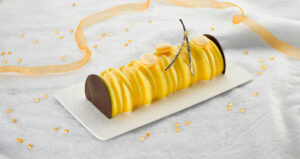 La Bûche Exotique, allie un croustillant mangue-passion avec un insert fruit de la passion et une onctueuse mousse à la vanille Bourbon. Le tout, recouvert d’un glaçage miroir jaune pour une touche étincelante.