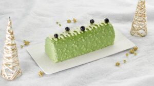 La Bûche Espérance, fait la part belle aux gourmands associant une bavaroise à la pistache avec un insert myrtille et un insert crémeux chocolat blanc-vanille Tahitensis. Pour une texture croquante, la bûche est soigneusement enrobée d’un glaçage façon rocher vert.