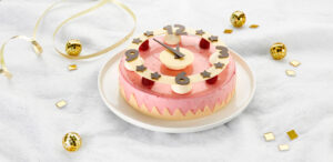 L’Horloge festive, se dévoile avec un décor horloge en chocolat pour les douze coups de minuit lors de la St Sylvestre mettant à l’honneur le mariage de la framboise et de la passion. Biscuit financier et fourrage croquant fruits rouges, accompagné d’un insert mangue-passion, le tout recouvert d’une mousse bavaroise framboise : une touche de fraicheur appréciée après un bon repas.