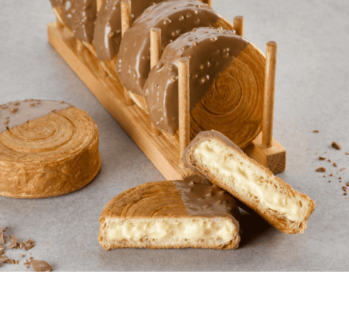 L’Entremets Douceur du Piémont rend hommage aux saveurs intemporelles de la pâtisserie traditionnelle. Il se compose de couches alternées de génoise cacao imbibée de sirop à la vanille Tahitensis et de crèmes au beurre mousseline, nature, chocolat et noisette du Piémont pour une dégustation riche et onctueuse.