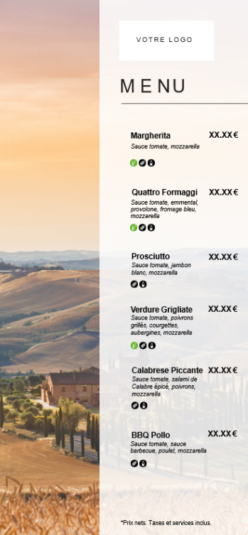 Il suffit de télécharger le thème souhaité pour votre établissement et de le personnaliser en fonction de votre offre (logo, assortiment de pizzas, prix, boissons, …). Pour plus de détails sur la personnalisation et l'impression, une notice est disponible sur la dernière page du menu.