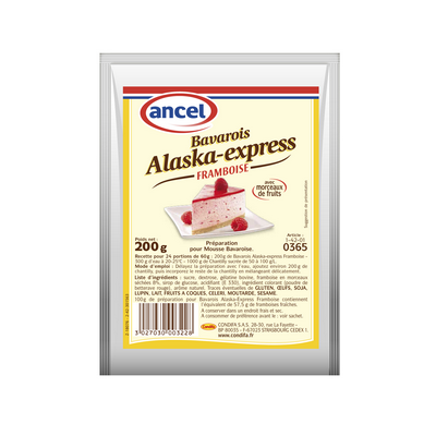 100 g de préparation pour Bavarois Alaska-Express Framboise contiennent l'équivalent de 57,5 g de framboises fraîches.