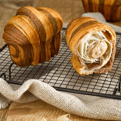 Etaler la pâte blanche sur 5 mm d’épaisseur. Couper en deux puis réfrigérer. Etaler la pâte cacao sur 5 mm d’épaisseur. Prendre un pâton de chaque pâte puis couper des bandes de 5 mm de large. Placer les bandes sur le pâton restant, en intercalant les couleurs sur le côté feuilleté visible, pour obtenir une surface rayée. Etaler la pâte sur 4 mm d’épaisseur puis couper des rectangles de pâte et les façonner comme des pains au chocolat. Placer dans un moule en aluminium préalablement graissé légèrement avec l’Agent de démoulage Ouragan ancel. Mettre en pousse puis cuire environ 20 min à 170 °C. Laisser refroidir puis injecter de la crème pâtissière choco cacahuète à l’aide d’une poche munie d’une douille adaptée. Décorer de chouchous.