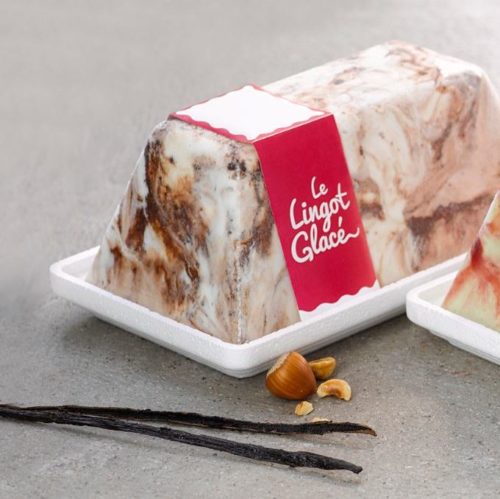 Sangler la glace vanille puis la chemiser dans les gouttières avant de surgeler quelques min. Réaliser l’insert noisette en déposant 250 g de marbrage dans chaque gouttière à l’aide d’une poche à douille puis surgeler à nouveau. Sangler la glace saveur choco-noisette et la répartir dans les gouttières. Déposer une bande de meringue noisette sur chaque gouttière puis surgeler. Démouler puis napper au pinceau avec le Nappage Miroir à froid Neutre ancel. Masquer les bords avec des morceaux de crumble cannelle puis décorer avec de la nougatine noisette.