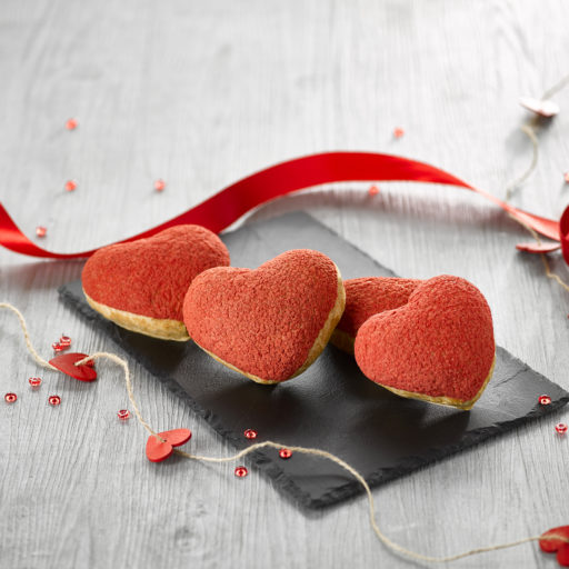 A l’aide de l’agent de démoulage Ouragan ancel, graisser légèrement les plaques de cuisson. Dresser les choux en forme de cœur à l’aide d’une poche munie d’une douille unie de 15 mm. A l’aide d’un emporte-pièce en forme de cœur de taille légèrement inférieure à celle des choux, détailler des cœurs de craquelin rouge puis les déposer sur les choux. Cuire à 180°C environ 35 min en four ventilé ou 45 min en four à sole. Après refroidissement, piquer le fond des choux puis garnir chacun d’entre eux de 20 g de fourrage à la framboise. Garnir ensuite l’espace restant ce crème pâtissière.