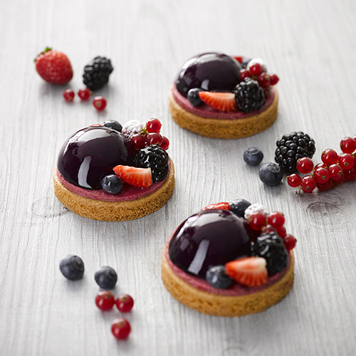 A l’aide d’une spatule lisser le dessus des sablés breton avec de la crème pâtissière. Déposer sur chaque fond un disque de fourrage croquant fruits rouges. Démouler puis glacer les dômes de crème légère à la myrtille encore congelés avec le glaçage miroir pourpre à 45°C. Réserver au congélateur quelques minutes. Déposer un dôme violet sur chaque tartelette en allant jusqu’au bord du sablé pour que celui-ci soit excentré. Décorer avec des fruits rouges préalablement nappés avec du Nappage Miroir à froid Neutre ancel.
