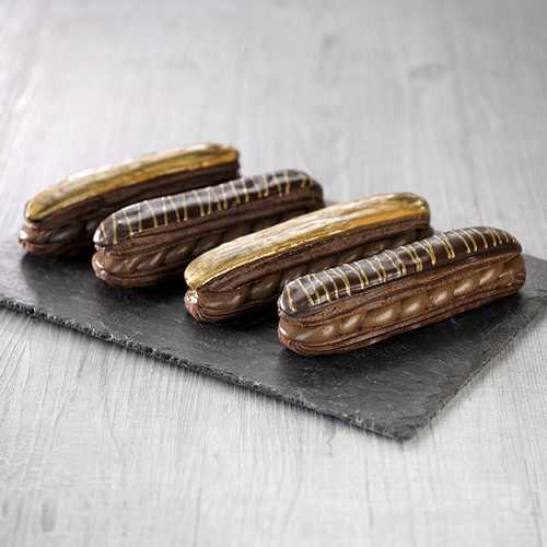 Réaliser la pâte à choux selon votre méthode habituelle. Prélever 500 g de pâte à choux puis dresser des éclairs de 14 cm de long sur une plaque graissée à l’aide de l’agent de graissage et de démoulage Ouragan ancel. Couper des bandes rectangulaires de craquelin de la taille de vos éclairs. Déposer une bande de craquelin sur chaque éclair puis cuire à 180°C environ 20 min en four ventilé tirage ouvert ou à 200°C environ 30 min en four à sole tirage ouvert.