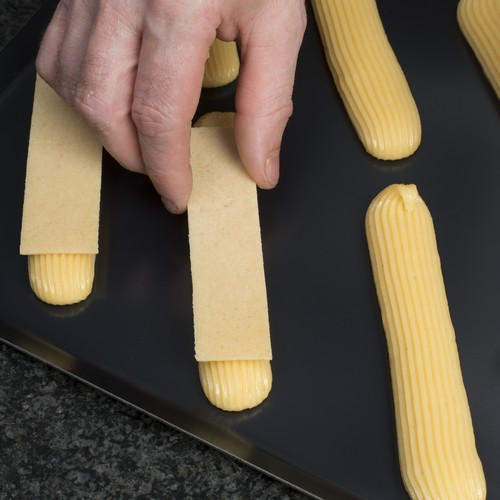Porter à ébullition dans une casserole, l’eau, le lait, le sel, le sucre et le beurre. Tamiser la farine. A ébullition, retirer du feu et incorporer la farine tout en remuant. Reporter sur feu doux pour dessécher le mélange jusqu’à ce que la pâte n’adhère plus aux parois de la casserole. Vider dans une cuve de batteur avec la feuille. Ajouter les oeufs graduellement jusqu’à la consistance voulue. Dresser la pâte à choux en forme d’éclairs à la poche munie d’une douille cannelée sur plaque graissée ou recouverte de papier cuisson. Disposer un rectangle de crumble sur chaque éclair.