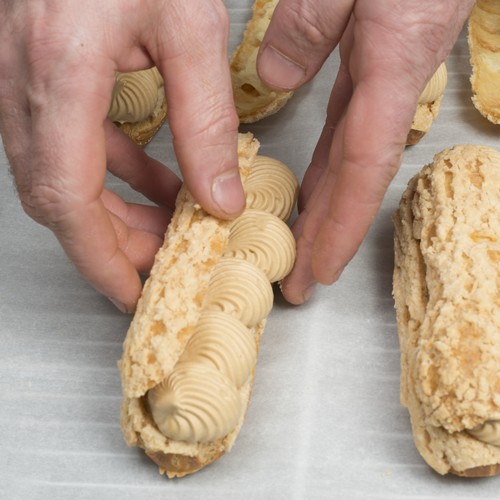 Couper au couteau scie les éclairs dans le sens de la longueur. Lisser la crème pâtissière au café Pur Arabica à l’aide d’un fouet. Garnir d’un trait de crème pâtissière au café Pur Arabica avec une poche à douille, puis réaliser sur la crème pâtissière des boules de crème mousseline au café Pur Arabica à l’aide d’une poche munie d’une douille. Disposer le dessus des éclairs sur la crème mousseline. Saupoudrer légèrement de sucre neige décor.