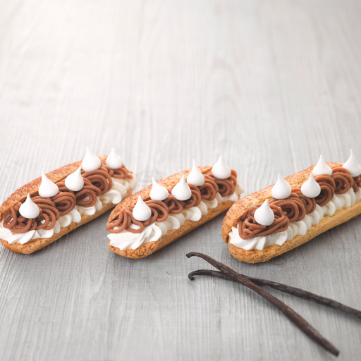Réaliser la pâte à choux selon votre méthode habituelle. Prélever 500 g de pâte à choux puis dresser 12 éclairs de 14 cm de long sur une plaque graissée avec de l’agent de graissage Agrano.