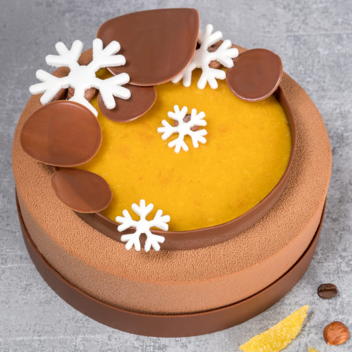 Préparer des cercles de 16 cm de Ø avec rhodoïd, peser 350 g de mousse mascarpone café par cercle, ajouter l’insert de crémeux café puis relisser avec une couche de mousse. Finir par l’insert de gelée d’orange avec le biscuit et le croustillant en semelle. Pulvériser l’entremets surgelé avec un flocage chocolat au lait. Napper l’insert de gelée d’orange au pistolet puis déposer au centre de l’entremets.