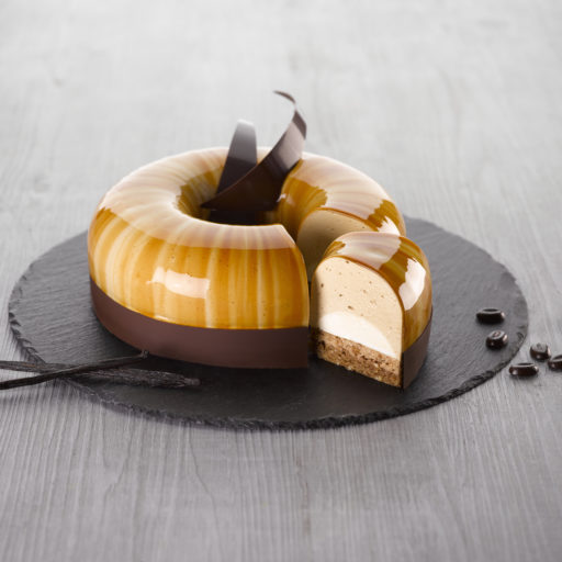 Faire fondre le glaçage à environ 50°C. Laisser refroidir à 45°C et diviser le glaçage dans deux récipients puis ajouter l’extrait de café dans l’un des deux. Verser simultanément les deux glaçages dans un récipient de manière à avoir le café d’un côté et le neutre de l’autre.