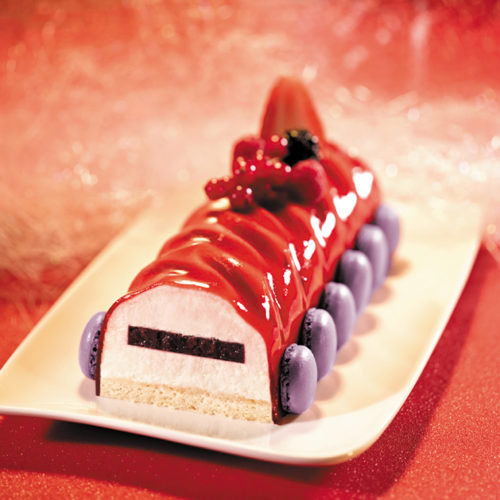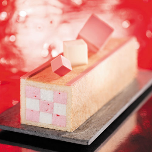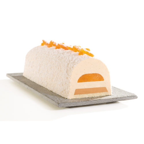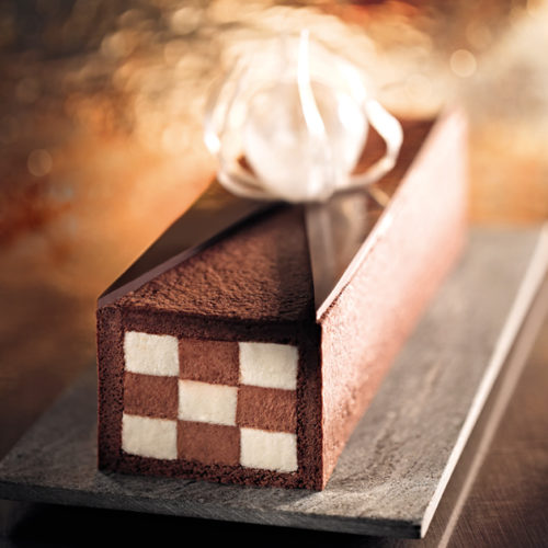 Déposer une feuille de biscuit Joconde au fond d’un cadre 40×60 cm posé sur une plaque recouverte de papier cuisson. Etaler uniformément la moitié de la bavaroise chocolat sur la feuille de biscuit. Mettre le ou les cadre(s) au surgélateur environ 30 minutes. Etaler la compotée de poire sur toute la surface de la bavaroise chocolat. Placer par-dessus une seconde feuille de biscuit Joconde puis étaler uniformément le crémeux caramel avant de placer la dernière feuille de biscuit Joconde.