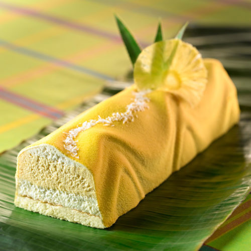 Napper le dessus de glaçage caramel puis retirer le cadre avant de le détailler en entremets.