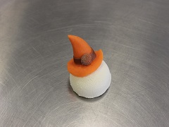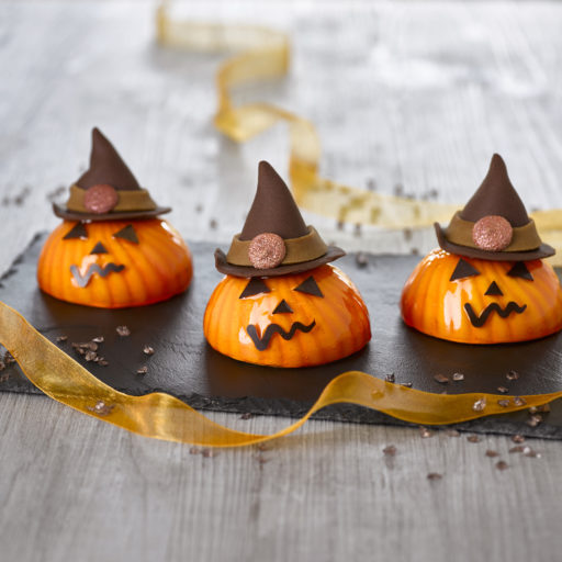 Répartir la bavaroise mangue dans les dômes puis placer les inserts en les enfonçant légèrement. Couvrir avec les fonds en mettant le côté fourrage croquant contre la bavaroise. Surgeler puis démouler, réserver au congélateur. Glacer avec le glaçage orange à 45°C. Décorer avec du chocolat noir pour les yeux, le nez et la bouche et des chapeaux en pâte d’amandes.