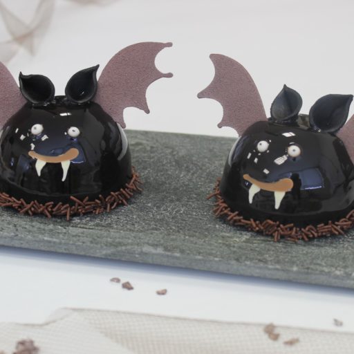 Détailler les fonds de 7 cm de Ø de biscuit recouverts de fourrage croquant chocolat noir et amandes caramélisées puis réserver au réfrigérateur. Répartir la moitié de la mousse bavaroise à la vanille dans les dômes en silicone puis déposer les inserts à la myrtille encore congelés en les enfonçant légèrement. Répartir le reste de mousse bavaroise à la vanille puis lisser à ras. Placer les fonds, côté fourrage croquant contre la bavaroise puis surgeler. Démouler puis glacer les dômes avec le glaçage miroir noir à 35°C. Masquer les bords de vermicelles chocolatés. Réaliser des ailes en chocolat noir avec de la couverture tempérée. Placer celles-ci au surgélateur quelques minutes avant de les floquer avec du Spray Velours brun ancel à une distance d’environ 30 cm. Réaliser des oreilles, des yeux et des dents de vampire en Pâte d’amandes 23% ancel. Mettre en place les décors.