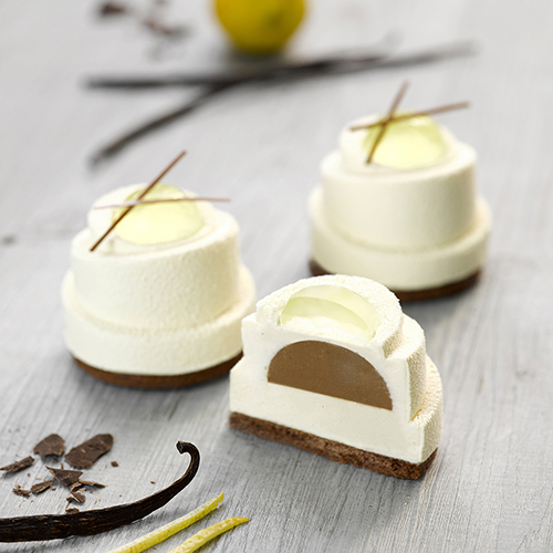 Répartir la moitié de la bavaroise à la vanille dans les moules individuels en silicone puis placer un insert de crémeux chocolat au lait Yuzu. Répartir le reste de bavaroise à la vanille puis surgeler avant de démouler. Pulvériser les entremets encore congelés avec le spray velours blanc à une distance d’environ 25 cm. Déposer les entremets sur les fonds de pâte sablée. Déposer un mini dôme de gelée de Yuzu sur le dessus puis décorer avec des décors en chocolat au lait.