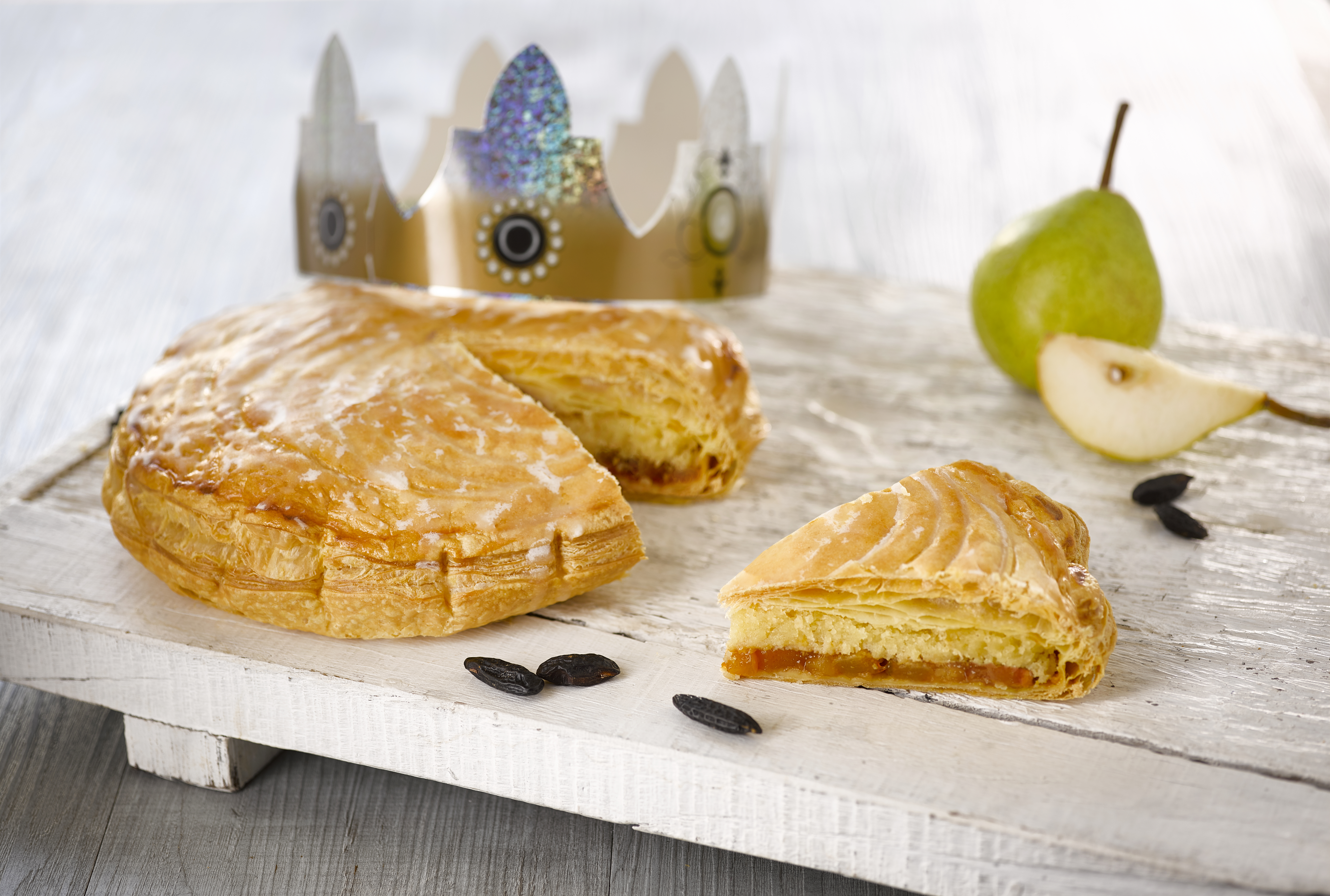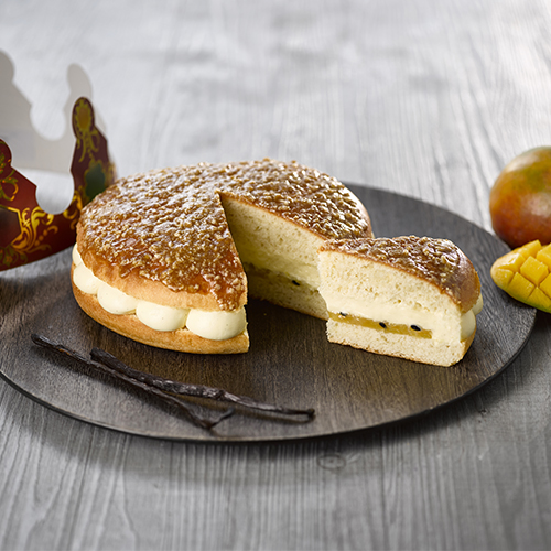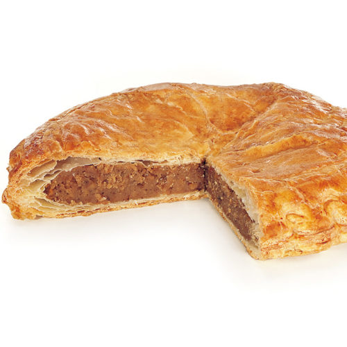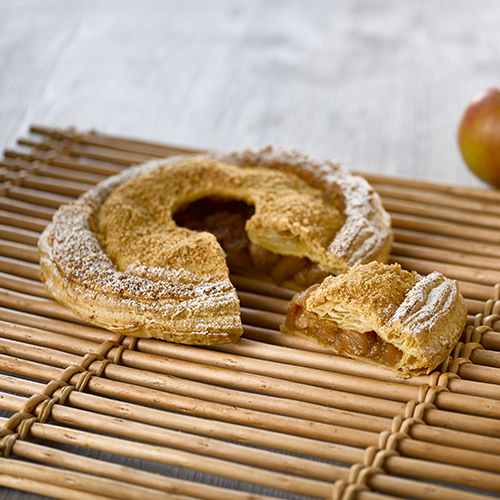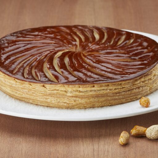 Détailler des fonds de pâte feuilletée de 24 cm de diamètre et de 2,5 mm d’épaisseur puis les déposer sur des plaques recouvertes de papier cuisson. Dorer les bords puis dresser en spirale de la frangipane cacahuète jusqu’à environ 3 cm des bords. Placer les fèves. Recouvrir d’un disque de feuilletage caramel puis bien souder les bords en prenant soin de ne pas faire ressortir la frangipane. Réaliser des scarifications en entaillant légèrement la pâte à l’aide d’un couteau d’office. Ne pas dorer le dessus avant cuisson. Cuire à 160°C environ 45 min. Dès la sortie du four, badigeonner les galettes avec le sirop pour un effet brillant.