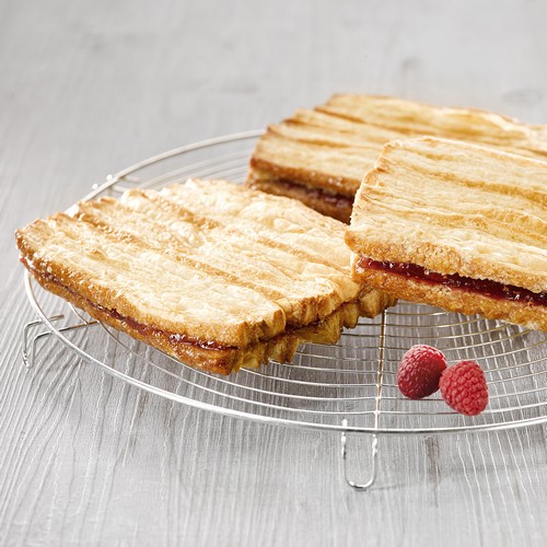 Etaler le fourrage framboise à l’aide d’une spatule sur 10 feuilletés puis poser un second feuilleté sur le fourrage.