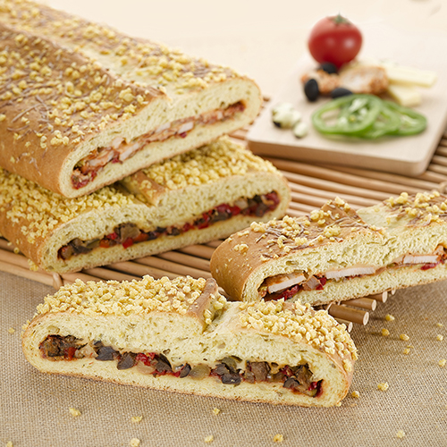 Préparer deux plaques recouvertes de papier cuisson. Diviser la pâte en deux, puis étaler chaque pâton de la taille des plaques. Déposer la garniture choisie sur la moitié de la surface en une bande centrale dans le sens de la longueur. Replier un côté pour couvrir la moitié de la garniture. Humidifier la partie repliée. Rabattre l’autre côté en chevauchant la pâte de 2 cm. Coller en appuyant légèrement. Mouiller le dessus, parsemer de Décor Maïs Agrano et d’emmental râpé. Mettre en pousse environ 1 heure 30 min à 25°C puis cuire à 220°C environ 35 min. Les temps et température de cuisson sont donnés à titre indicatif et peuvent varier selon le matériel utilisé.