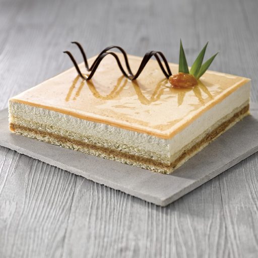 Ramollir si nécessaire le fourrage croquant caramel au micro-onde puis l’étaler dans le cadre sur la première feuille de financier. Déposer la deuxième feuille de financier puis la recouvrir avec la mousse royale à la vanille. Surgeler puis retirer le cadre. Napper la surface avec le nappage miroir. Détailler en entremets puis décorer.