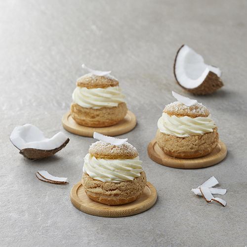 Verser l’eau froide dans la cuve du batteur, ajouter la pâte aromatique de noix de coco et la préparation pour crème diplomate à froid. À l’aide du fouet, mélanger 1 minute en première vitesse puis battre 4 minutes à grande vitesse. La crème doit être réalisée juste avant le garnissage des choux.