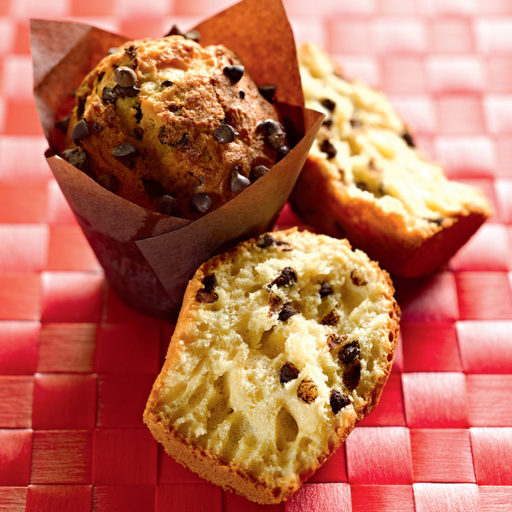 Décorer les muffins de quelques pépites de chocolat, puis cuire environ 30 min en four ventilé ou 40 min en four à sole à 180 °C.