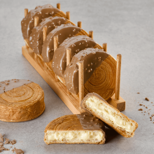 Etaler la pâte à croissant sur 4 mm d’épaisseur et sur environ 35 cm de large. Rouler la pâte vers soi puis couper des morceaux de 3 cm d’épaisseur. Placer les Rolls dans des cercles graissés à l’agent de démoulage Ouragan ancel de 10 cm de Ø et de 3 cm de haut. Mettre en pousse environ 2 heures à 25°C puis déposer sur les cercles un papier de cuisson et une plaque de cuisson pour permettre aux Rolls de rester bien plats. Cuire à 170°C environ 15 min en four ventilé. Retirer les cercles et laisser refroidir les New York Rolls.
