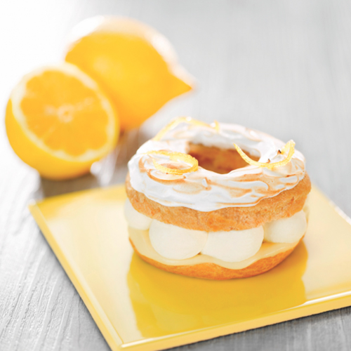 Couper les pièces de pâte à choux en deux puis garnir chaque fond de 30 g de crème pâtissière au citron. Dresser ensuite 50 g de crème légère au citron à la poche à douille. Etaler la meringue italienne sur le dessus des pièces de pâte à choux puis la caraméliser au chalumeau. Déposer les pièces de pâte à choux meringuées sur la crème légère. Décorer de zestes de citrons confits.