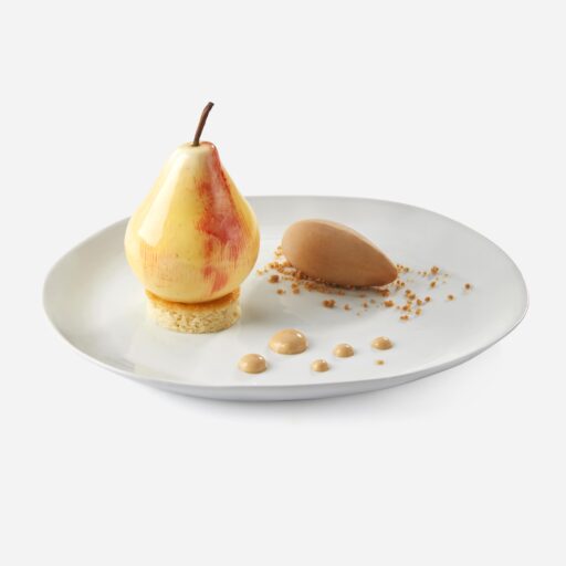 Remplir aux ¾ les moules de bavaroise à la vanille Bourbon. Insérer dans chaque moule, deux dômes de fourrage poire façon Tatin apposés l’un contre l’autre pour former une boule. Surgeler puis démouler, réserver au congélateur. À l’aide d’un pinceau, brosser légèrement les poires avec du Colorant Rouge Sébalcé puis tremper les poires dans le glaçage miroir à 45°C. Déposer les poires sur les fonds de sablés breton puis placer les entremets quelques minutes au congélateur afin de fixer le glaçage. Décorer avec des tiges de poires en chocolat. Au dressage, ajouter une quenelle de glace au caramel et de la crème anglaise au caramel.
