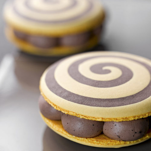 Répartir successivement les mousses bavaroises chocolat et poire à la poche à douille cannelée dans chaque P’tit pot, en disposant les poires en cubes au milieu des deux mousses. Napper le dessus avec le nappage chocolat puis décorer avec des amandes effilées.