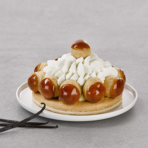 Glacer les choux en les trempant dans le caramel puis les déposer sur une plaque recouverte de papier cuisson. Laisser refroidir complètement le caramel. Réchauffer si besoin le restant de caramel pour coller 3 choux sur le contour de chaque Saint Honoré. A l’aide d’une poche munie d’une douille cannelée, dresser la chantilly à la vanille entre les choux puis dresser une rosace au milieu.