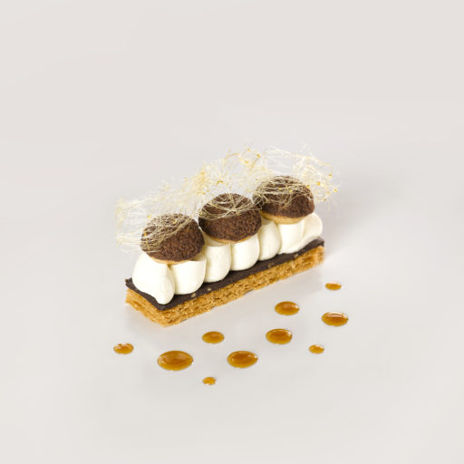 Garnir les choux de crème pâtissière au chocolat puis réserver au frais. Couper des rectangles de feuilletage de 4 x 11 cm. Couper des rectangles de croustillant au chocolat noir et amandes caramélisées de 4 x 11 cm puis les déposer sur les rectangles de feuilletage. Les chutes pourront être réutilisées. Dresser la crème diplomate à l’aide d’une poche munie d’une douille saint-honoré sur le fourrage croquant. Déposer 3 choux par pièce sur la crème. Décorer de cheveux d’ange en sucre et accompagner de Sauce Dessert Caramel ancel.