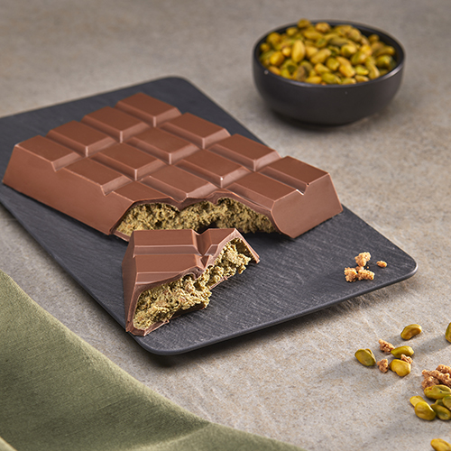 Mouler en deux couches 10 tablettes creuses de 165×110 mm. À la poche, déposer 300 g de fourrage croquant pistache par tablette. Fermer les tablettes à l’enrobeuse. Démouler après cristallisation.