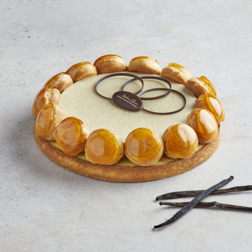 Foncer un cercle à tarte avec la pâte sablée puis garnir le fond d’une fine couche de crème d’amande afin de solidifier le fond et de l’isoler (environ 3 mm d’épaisseur). Cuire au ventilé à 160°C pendant 20 à 30 min environ. Garnir de crème pâtissière puis réserver quelques instants au réfrigérateur. Déposer l’insert de crème diplomate préalablement glacée avec du Glaçage Miroir Neutre ancel. Garnir les choux de crème pâtissière, réaliser le caramel puis glacer les choux. Disposer les choux glacés et décorer avec des fils chocolat et un logo.