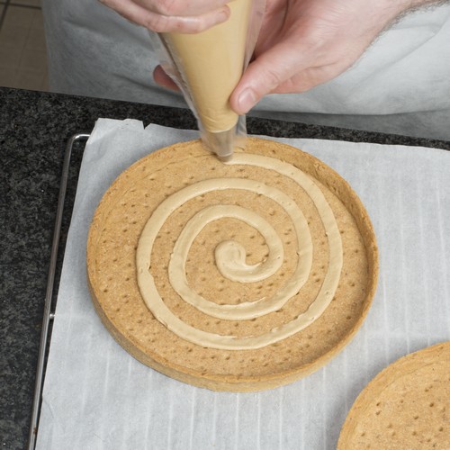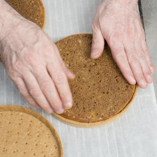 Monter au batteur le sucre glace, la poudre d’amande blanche, la farine, l’extrait de café et les oeufs entiers. Monter les blancs et le sucre, les incorporer dans le premier appareil puis ajouter le beurre fondu tiède. Dresser 220 g de biscuit Joconde au café Pur Arabica par moule puis cuire au four ventilé à 180°C pendant 8 à 10 min.
