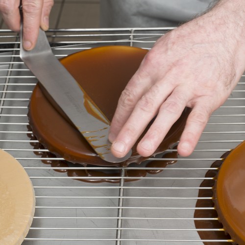 Tremper la gélatine dans de l’eau froide. Cuire le sucre à 185°C et décuire le caramel avec les 300 g d’eau chaude. Mélanger la crème et la fécule à froid et porter le tout à ébullition en remuant. Ajouter le caramel progressivement, la gélatine hydratée et égouttée puis l’extrait de café. Chinoiser et réserver au frais. Conseil d’utilisation : fondre intégralement le glaçage à 40°C et l’utiliser à 24°C.