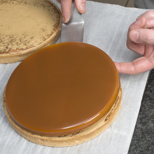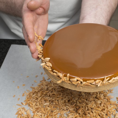 Déposer 75 g de crème mousseline au café Pur Arabica dans les fonds de tarte cuits. Déposer un disque de biscuit Joconde punché avec le sirop au café Pur Arabica puis lisser à ras avec le reste de crème mousseline au café Pur Arabica. Démouler le palet de crémeux au café Pur Arabica, le glacer à l’aide du glaçage caramel café Pur Arabica et le déposer au centre de la tarte. Garnir le tour de la tarte d’amandes caramélisées. Décorer avec des macarons au café et des fils chocolat.