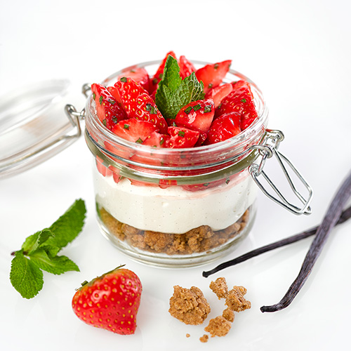 Répartir le crumble dans les verrines, répartir la mousse au fromage blanc puis réserver au réfrigérateur pendant une à deux heures. Répartir les fraises à la menthe puis décorer avec une tête de menthe.