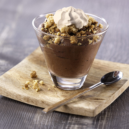Saupoudrer les verrines mousse chocolat avec du crumble et une pointe de crème Carambar. Décorer avec un Carambar entier.