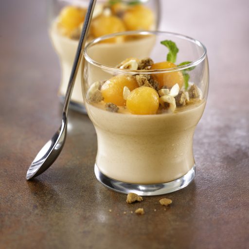 Au moment de servir, répartir des billes de melon sur le dessus de la crème et saupoudrer du mélange speculoos émiettés/éclats de noisettes. Déposer une feuille de menthe sur le dessus.