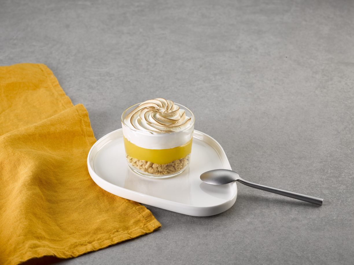 Dans la verrine, disposer à la poche de la crème diplomate à la noisette du Piémont. Puis un peu de praliné, à nouveau une couche de crème diplomate et du praliné.