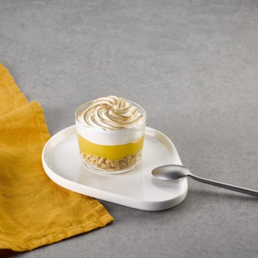 Répartir le crumble dans le fond des verrines puis pocher la garniture passion par-dessus. Dresser la meringue italienne et caraméliser au chalumeau.